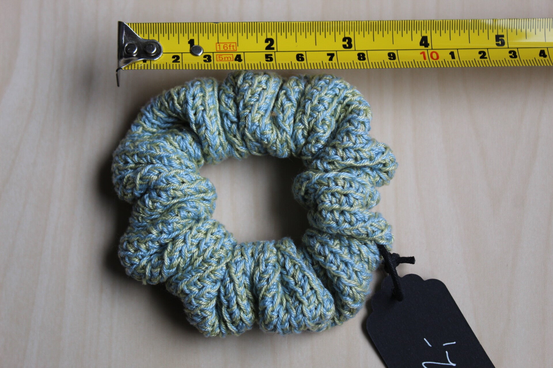 Löytölangoista virkattu, tavallisen kokoinen hiusdonitsi.