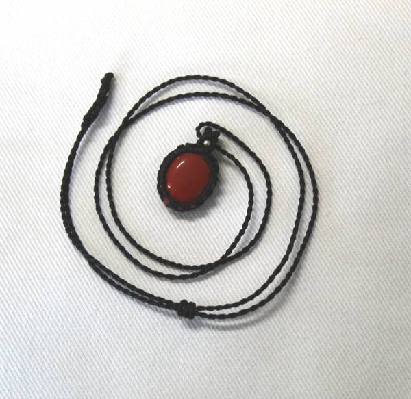 Makrameetyylillä näperrelty riipus jonka sydämenä aito punainen jaspis. Koko/pituus säädettävissä makrameesolmun avulla. Turkulaista käsityötä. Jokainen kivikoru on uniikki ❤️