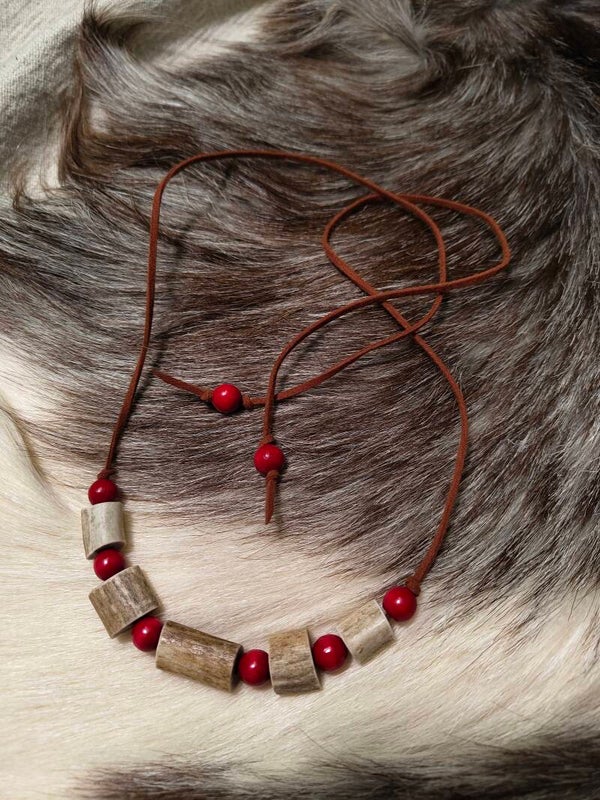 Kaunis luontohenkinen kääty, jossa poronsarvea ja puisia helmiä. Nauha mokkaa, saapi sitoa itse kiinni miten tykkää.