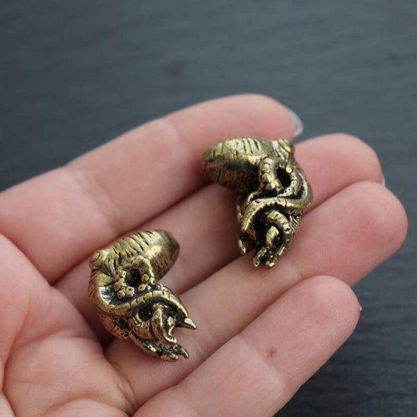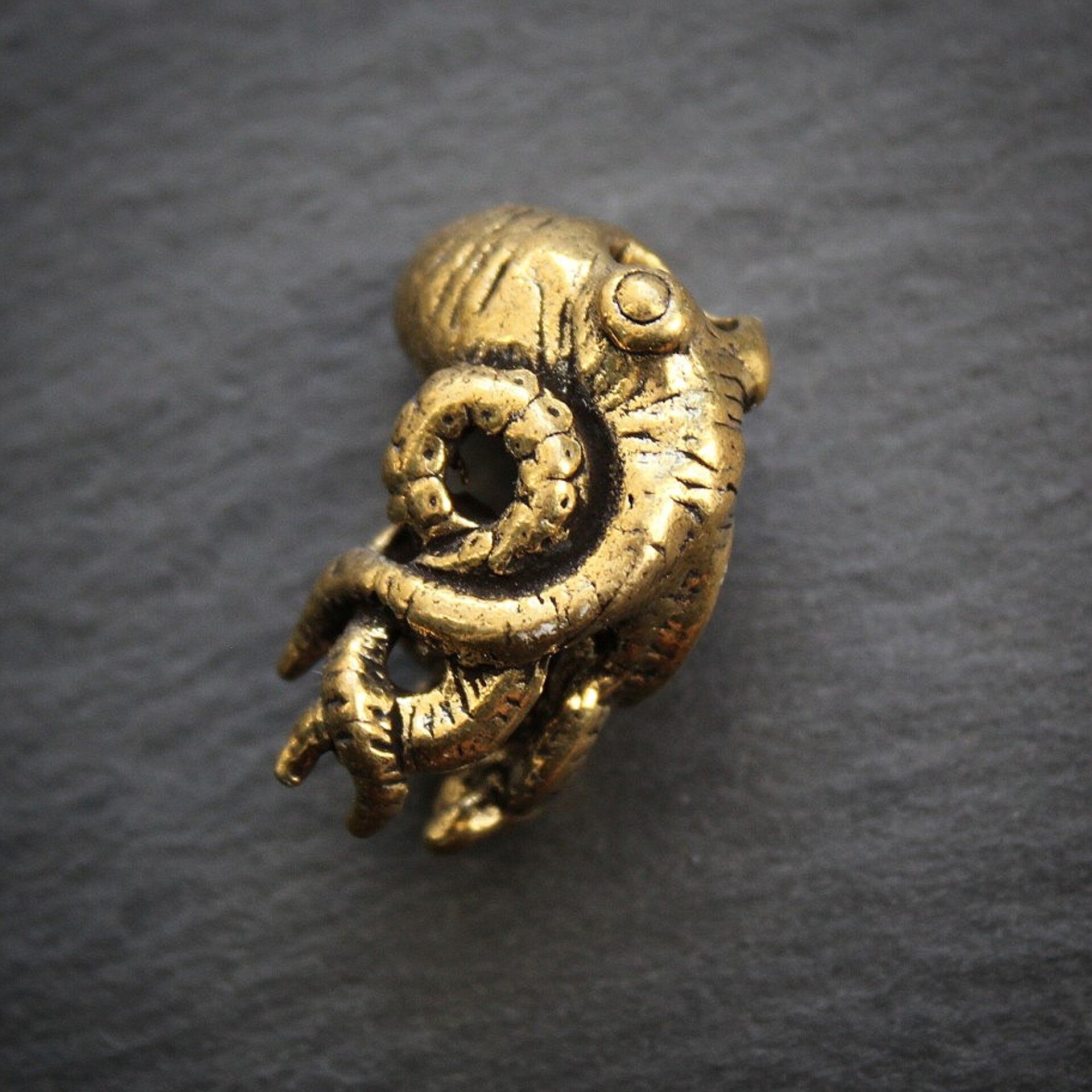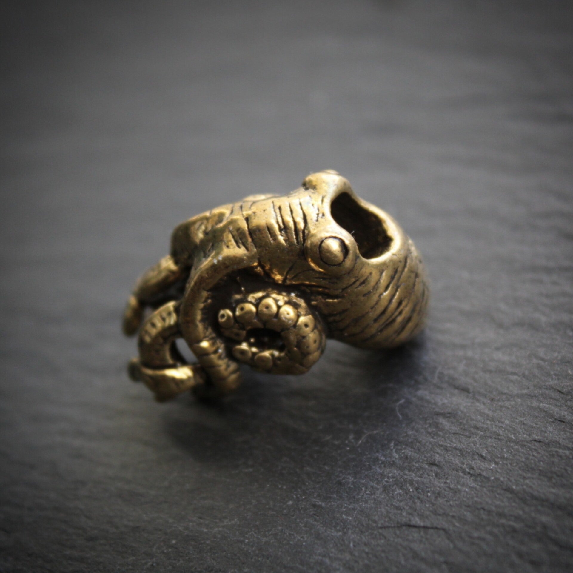 Jytky messinkikoru mustekalan hahmossa. Helmen pituus 2,6cm, leveys n.2cm, reiän halkaisija n.6mm