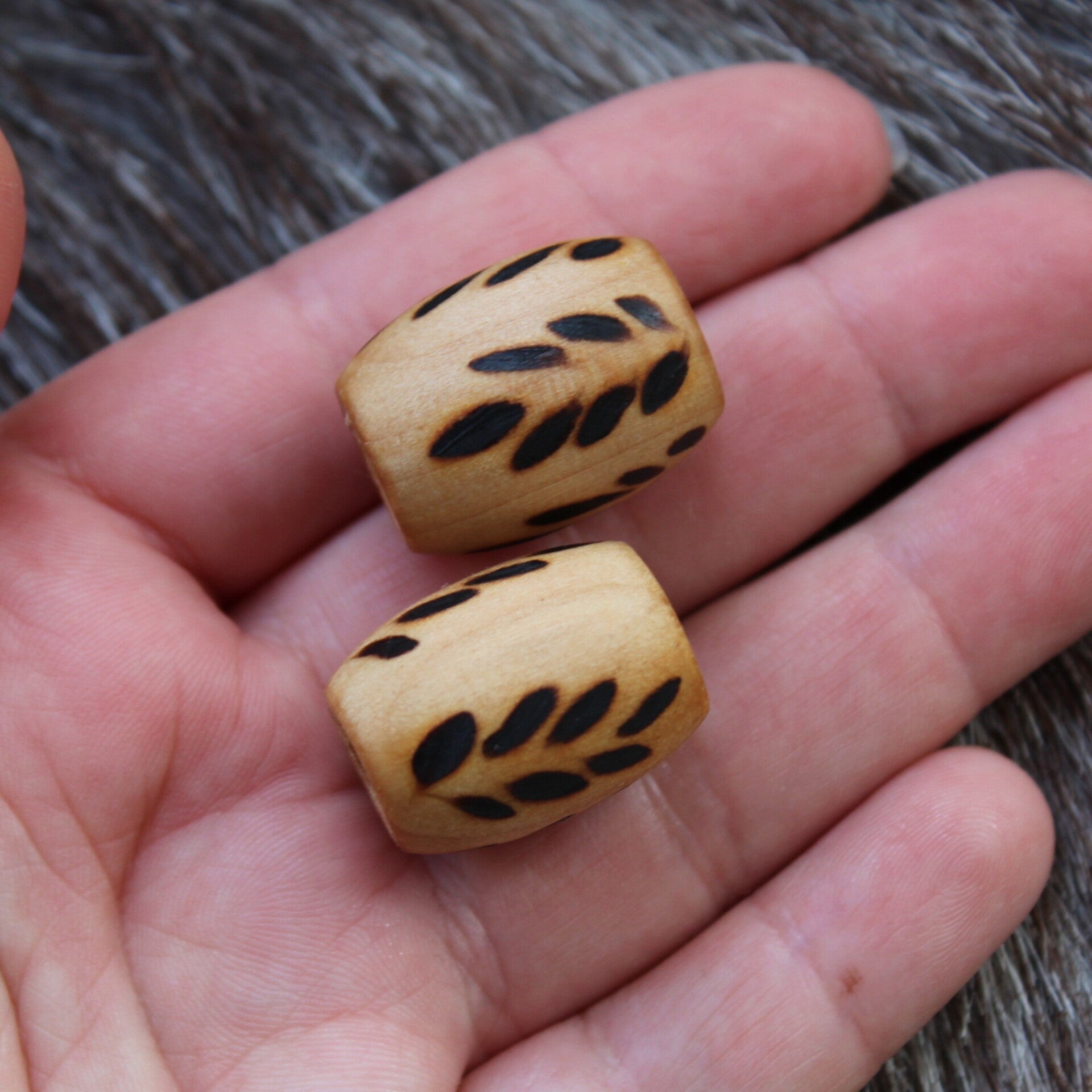 Vaalean puun värinen, kauniilla lehtikuvioinnilla polttokoristeltu puinen helmi.