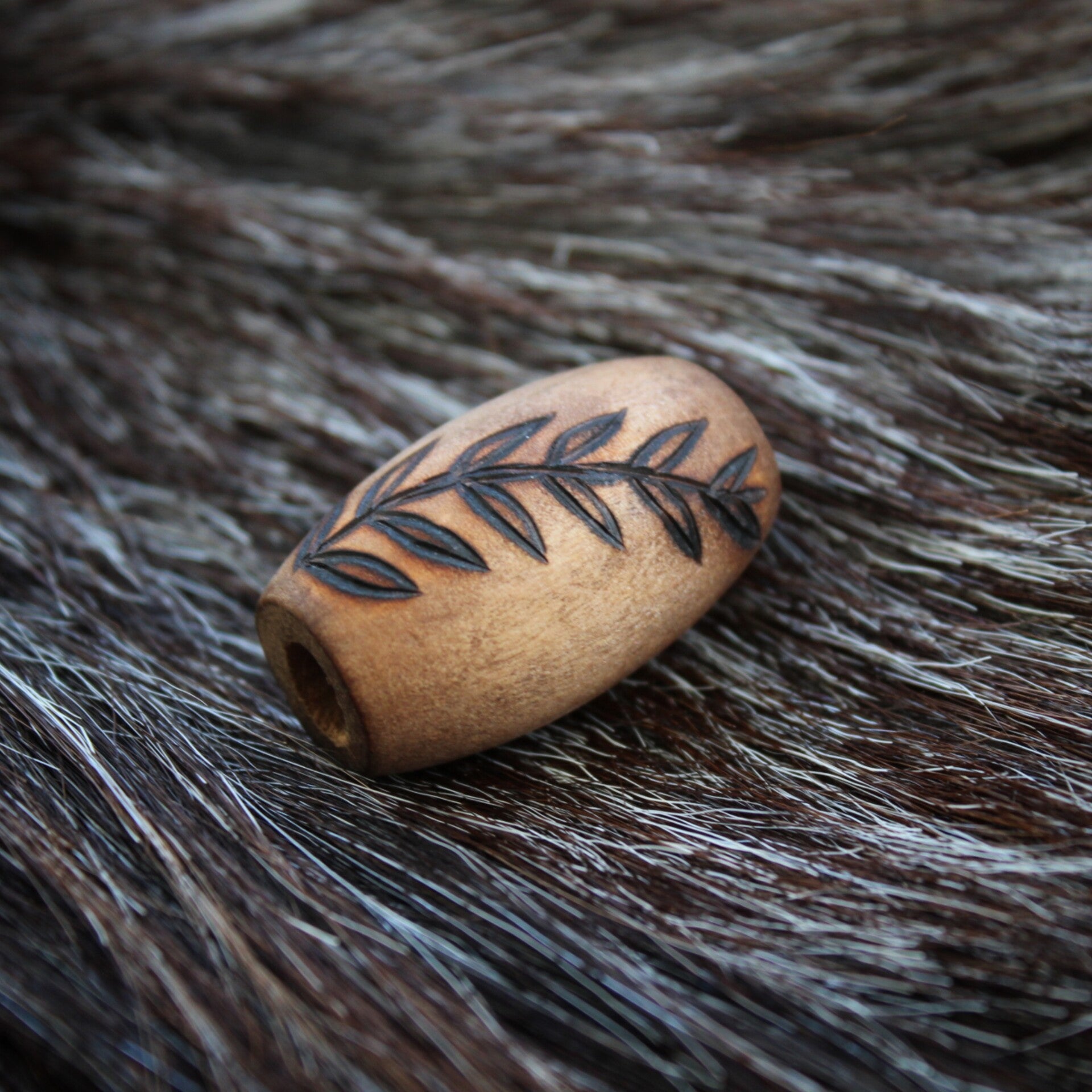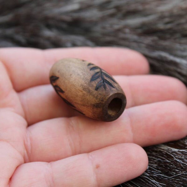 Pidemmän mallinen, kauniilla lehtikuviolla polttokoristeltu puinen helmi.