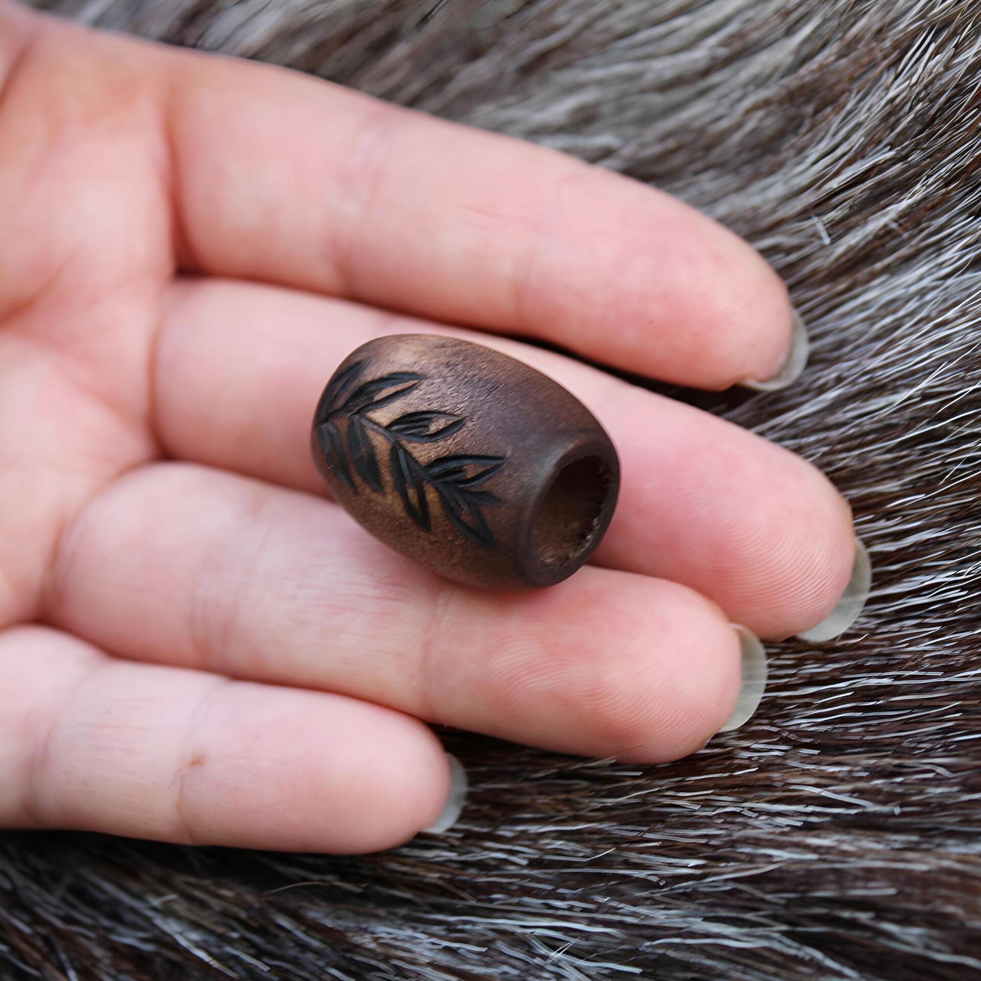 Tumman puun värinen, kauniilla lehtikuviolla polttokoristeltu puinen helmi.
