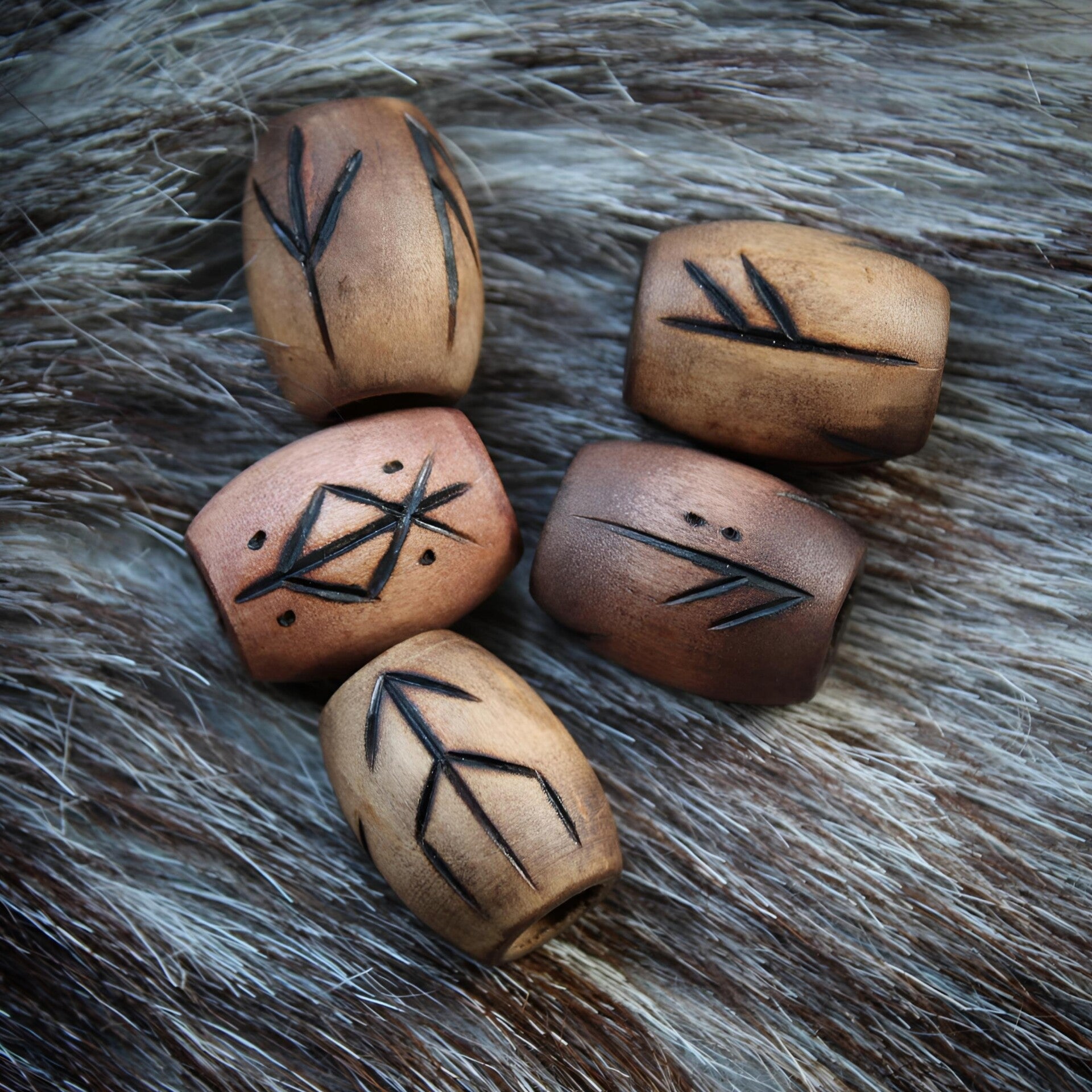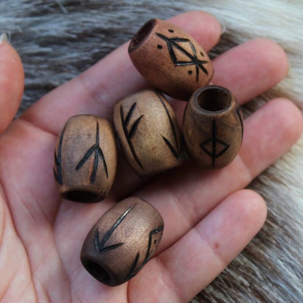 Kauniilla riimukuvioinnilla polttokoristeltu puinen helmi.