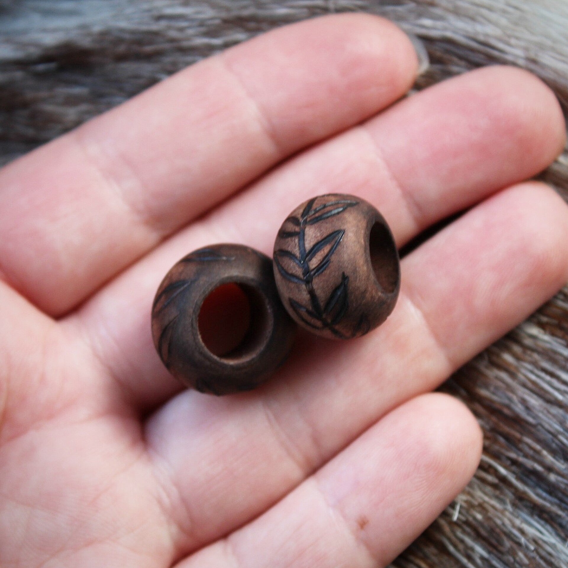 Tummaksi värjätty, kauniilla lehtikuviolla polttokoristeltu puinen helmi.