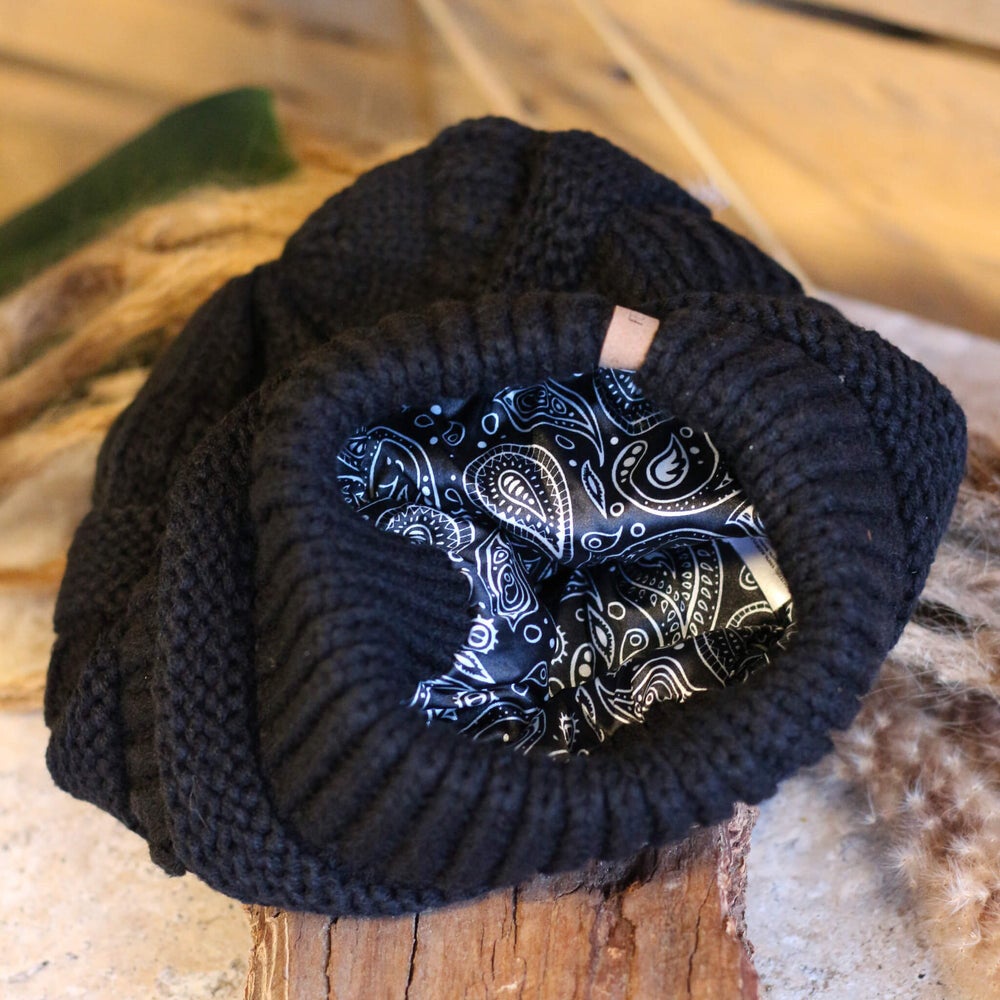 Löysempi satiinivuorattu pipo. Sopii sekä takkutukalle, että vapaana liehuville kutreille!