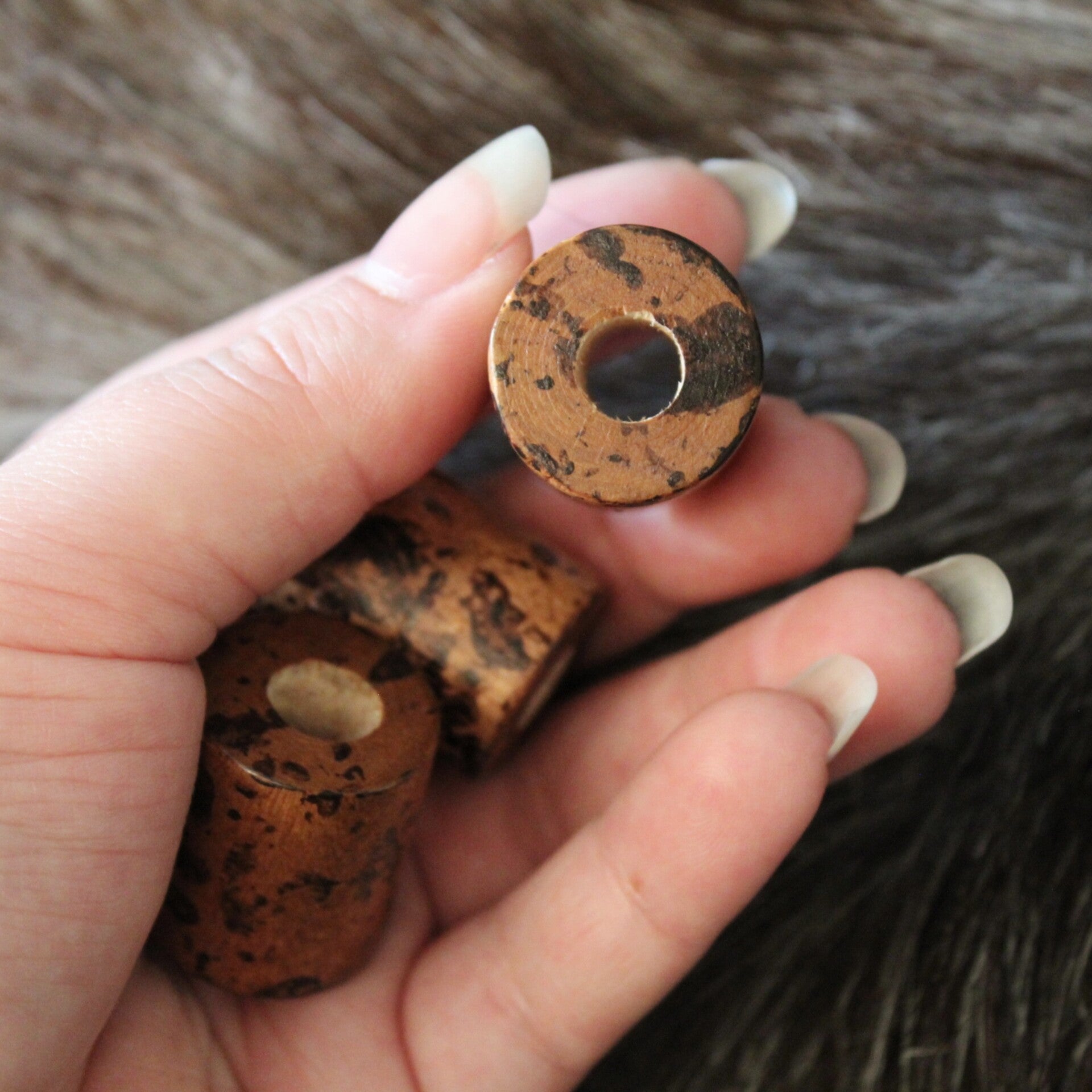 Reiän halkaisija n. 7mm, helmen pituus n. 2,5cm, leveys keskeltä n. 2cm. Myydään yksittäin, jokainen helmi on uniikki kipale.