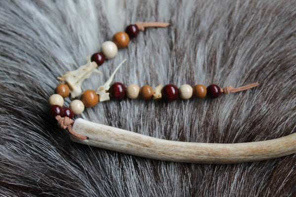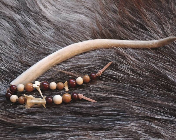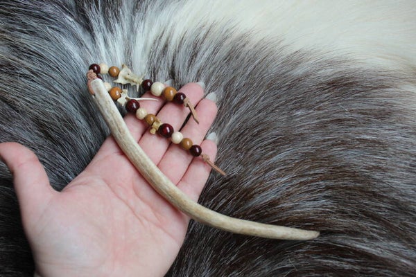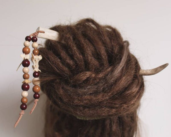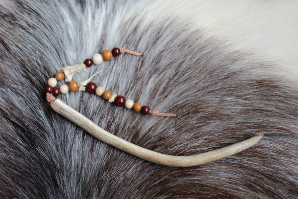 Sarviluinen kaunis nutturakoriste puisilla helmillä ja pienillä luilla. Sopii arkeen tai juhlailmeen täydentämiseen, helppo tökätä monenlaisen kampauksen sekaan.