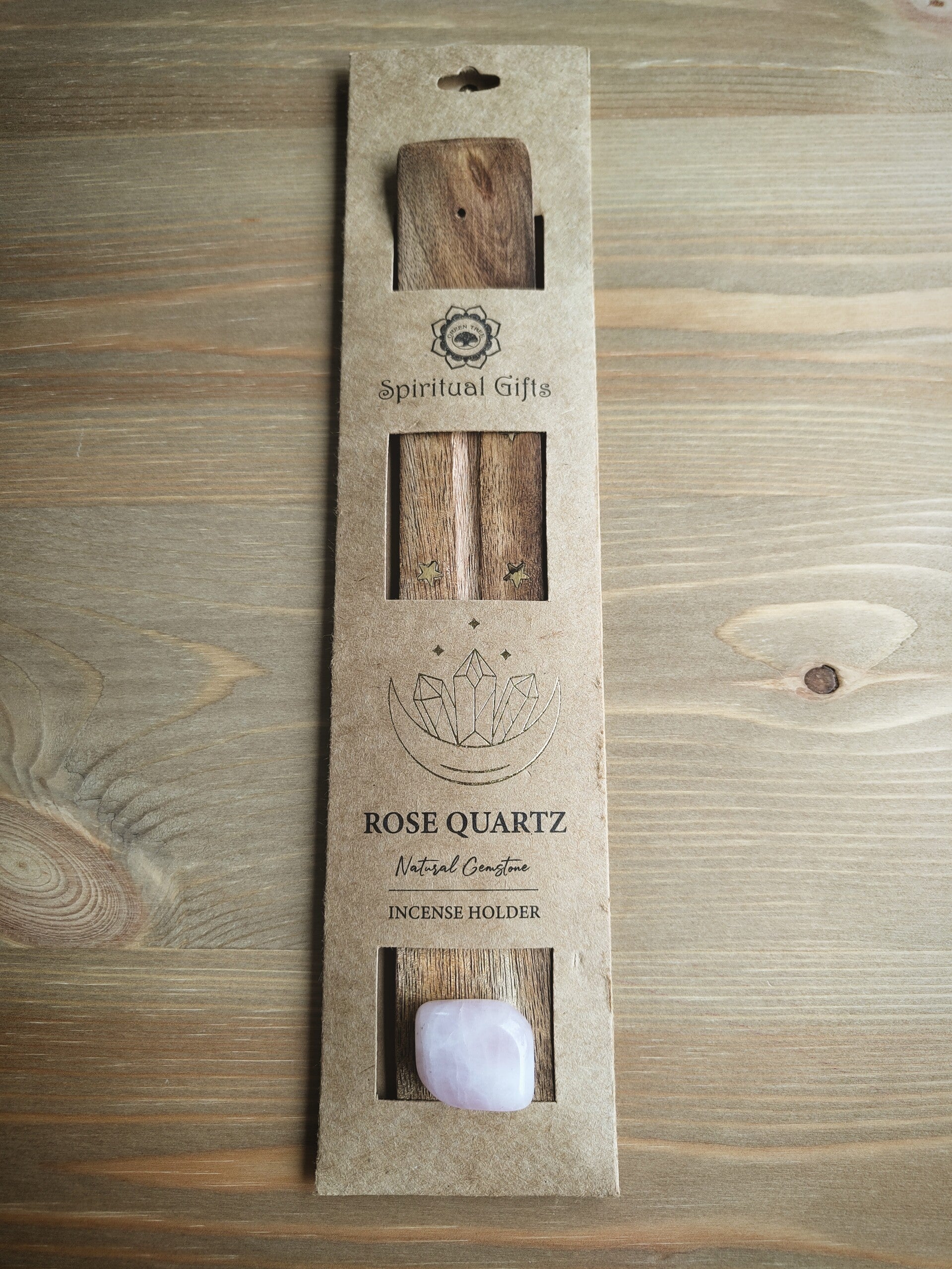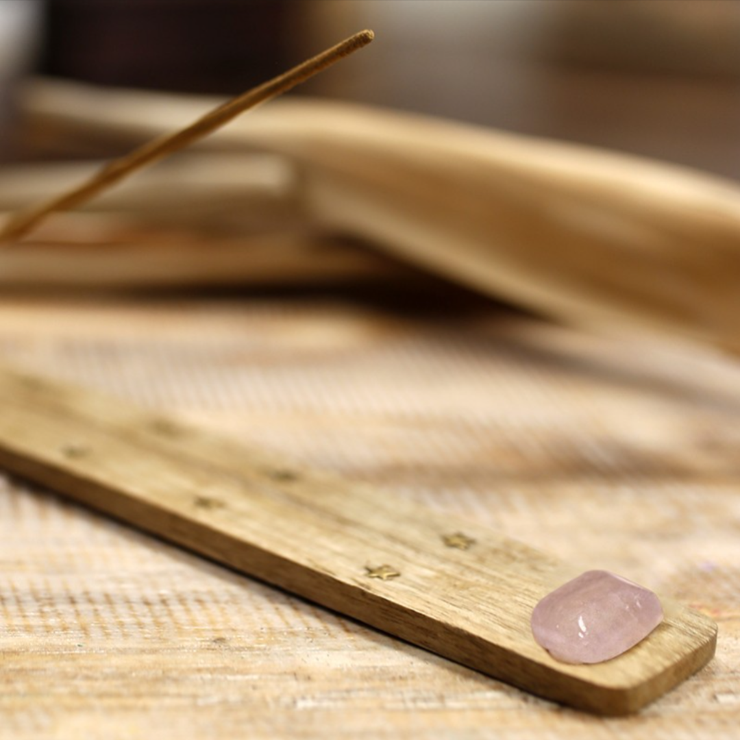 Kaunis mangopuinen suitsukepidike, jonka päässä istuskelee ruusukvartsi.