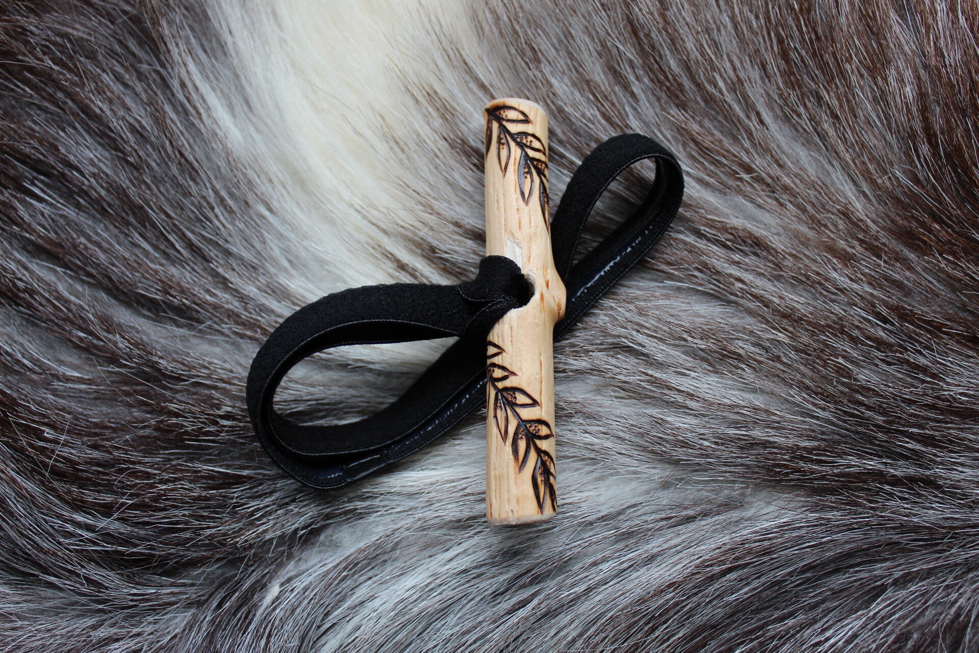 Puinen "dread toggle". Polttokoristeltuun koivunoksan palaseen on sidottu kestävä kuminauha, jonka sisäpuolella on silikonipinta antamassa lisäpitoa. Tyyli solmimisessa täysin vapaa, kuvissa esimerkkikiinnitys. (Kannattaa pyöräyttää koko kuminauha takkujen ympäri ja lukita takaisin puuhun. Tarkoitus ei ole laittaa takkuja kuminauhan "läpi".)