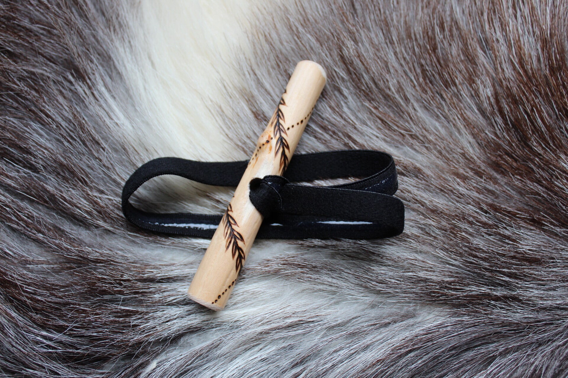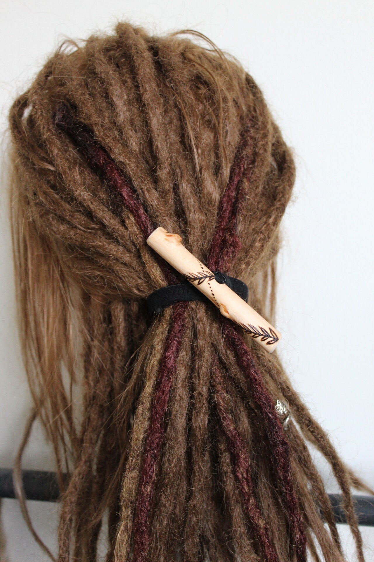 Puinen "dread toggle". Polttokoristeltuun koivunoksan palaseen on sidottu kestävä kuminauha, jonka sisäpuolella on silikonipinta antamassa lisäpitoa. Tyyli solmimisessa täysin vapaa, kuvissa esimerkkikiinnitys. (Kannattaa pyöräyttää koko kuminauha takkujen ympäri ja lukita takaisin puuhun. Tarkoitus ei ole laittaa takkuja kuminauhan "läpi".)
