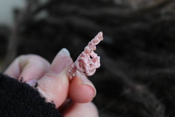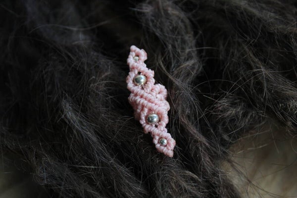 Väri vaaleanpunainen, pituus 3,5cm, helmien väri hopea, reiän halkaisija 5-6mm.