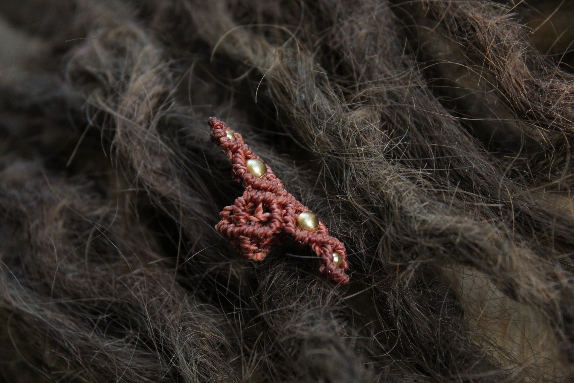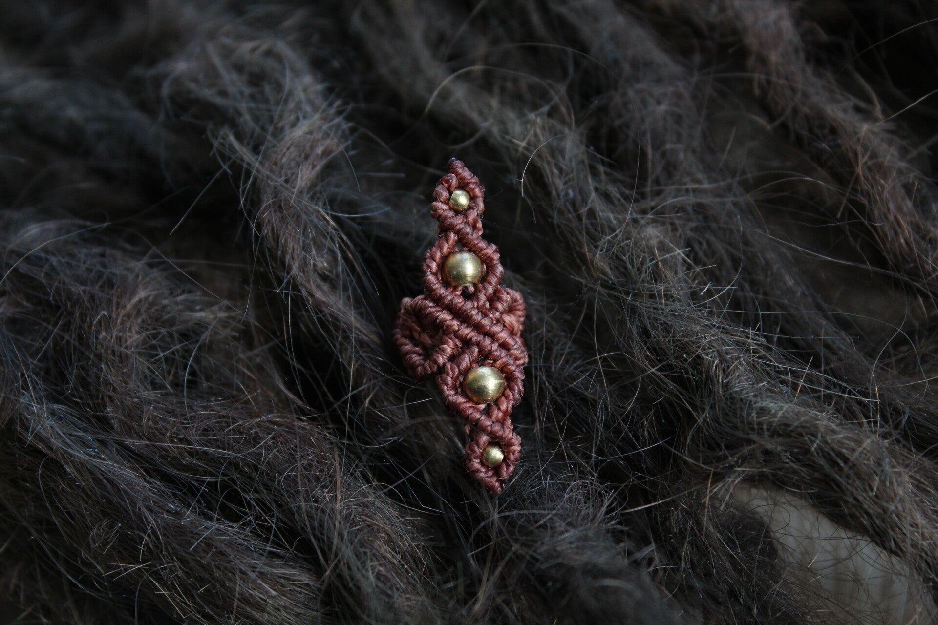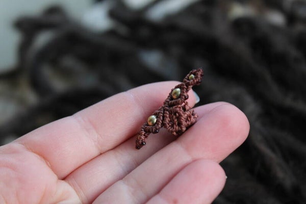 Väri tummanruskea, pituus 3,5cm, helmien väri kulta, reiän halkaisija 7-8mm.