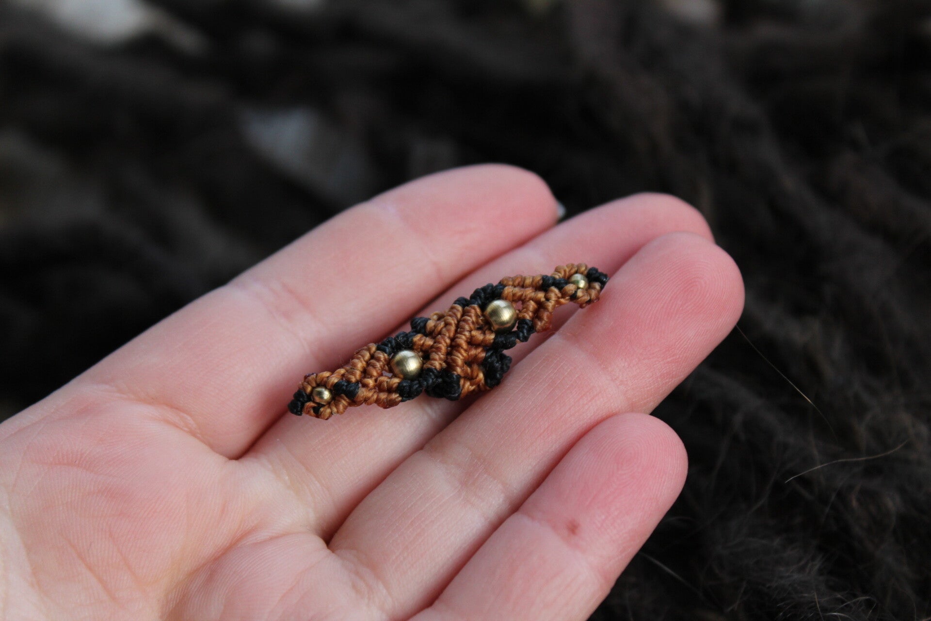 Väri lämmin ruskea ja musta, pituus 4,2cm, helmien väri kulta, reiän halkaisija 5-6mm.